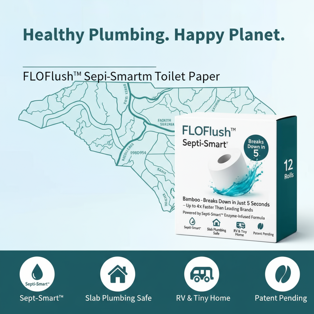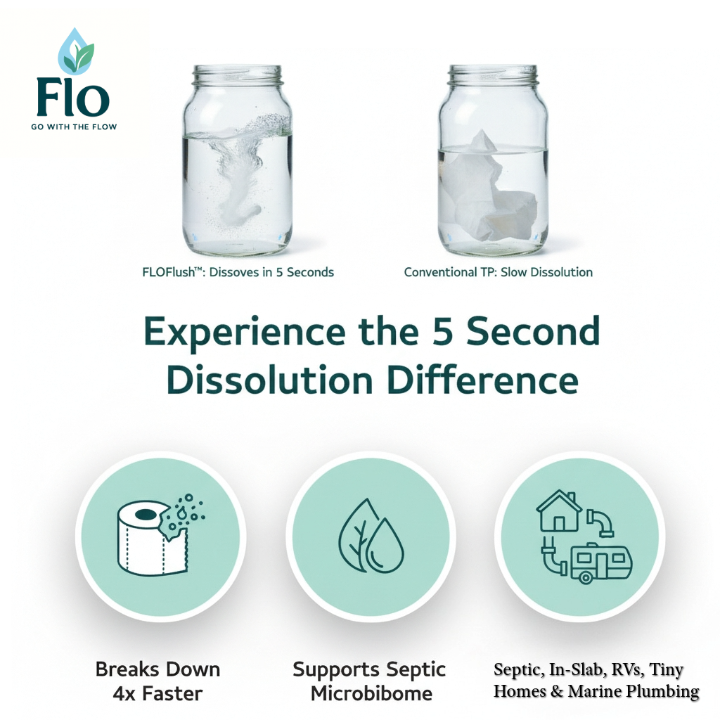 FLOFlush™ began with a simple question: “How can we protect septic system health while being environmentally responsible?” From that question, FLOFlush™ Septi-Smart™ was born—a first-of-its-kind, enzyme-infused toilet paper designed to safeguard septic systems, support slab plumbing, Tiny Homes and RV’s and reduce environmental impact.